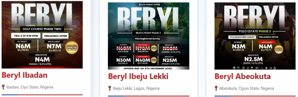 1. Beryl Golf Course, Beryl Beach Front and Beryl Polo Estate: Locations- Ibadan, Ibeju-Lekki and Abeokuta: