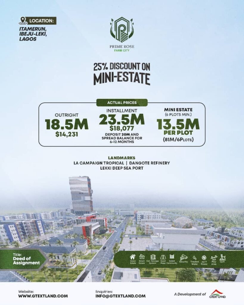 2. Prime Rose Farm City: Location- Itamerun, Ibeju-Lekki. Lagos.