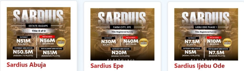 6. Sardius Estate Guzape Abuja, Sardius Farm City, Epe, Sardius Ijebu Ode.