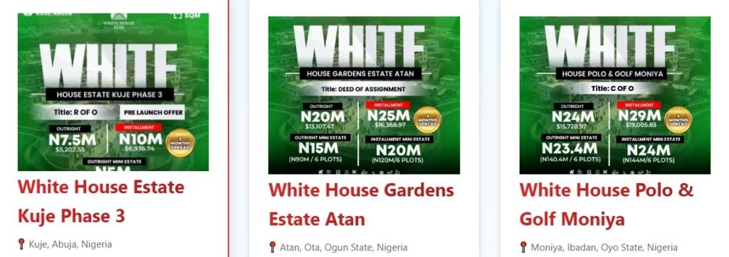 7. White House Estate, Kuje, White Gardens Estate Atan, White House Polo & Golf: Locaton- Keju Abuja, Atan and Moniya Ibadan.